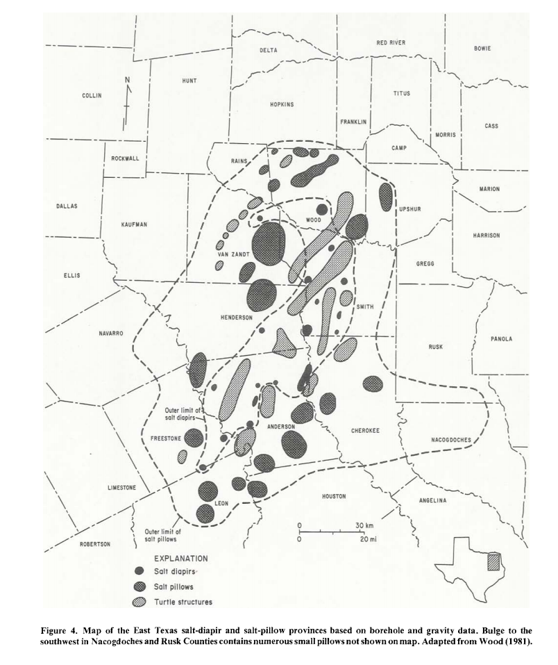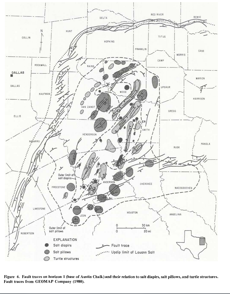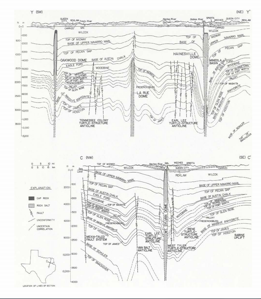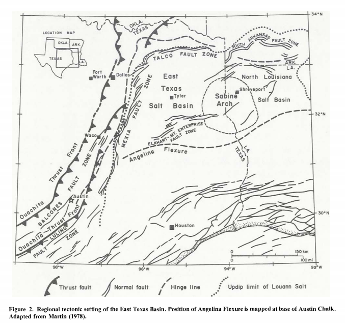 parallels the Gulf Coast and dips beneath the land surface toward the coast, except in the East Texas structural basin adjacent to the